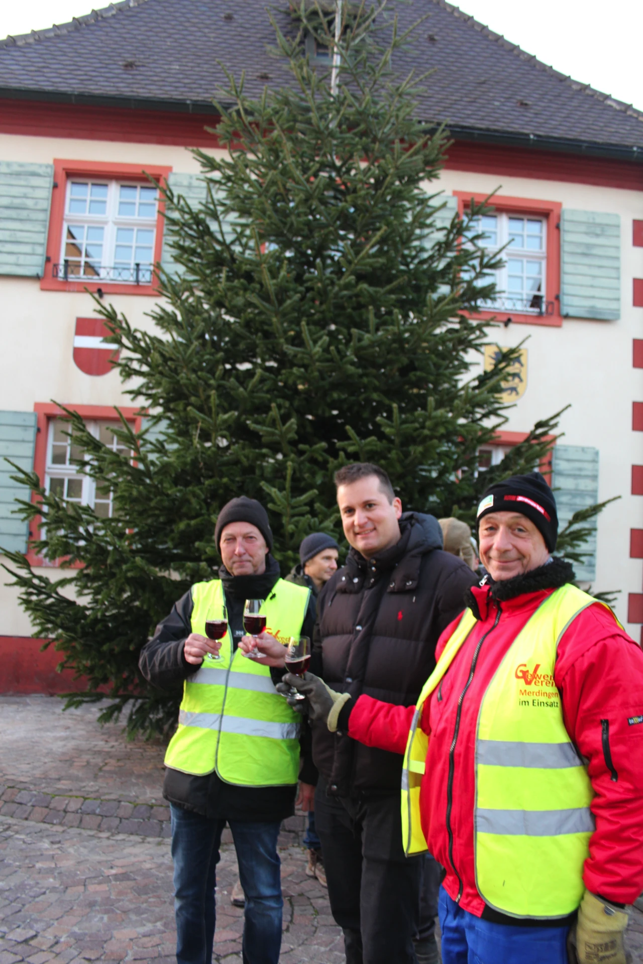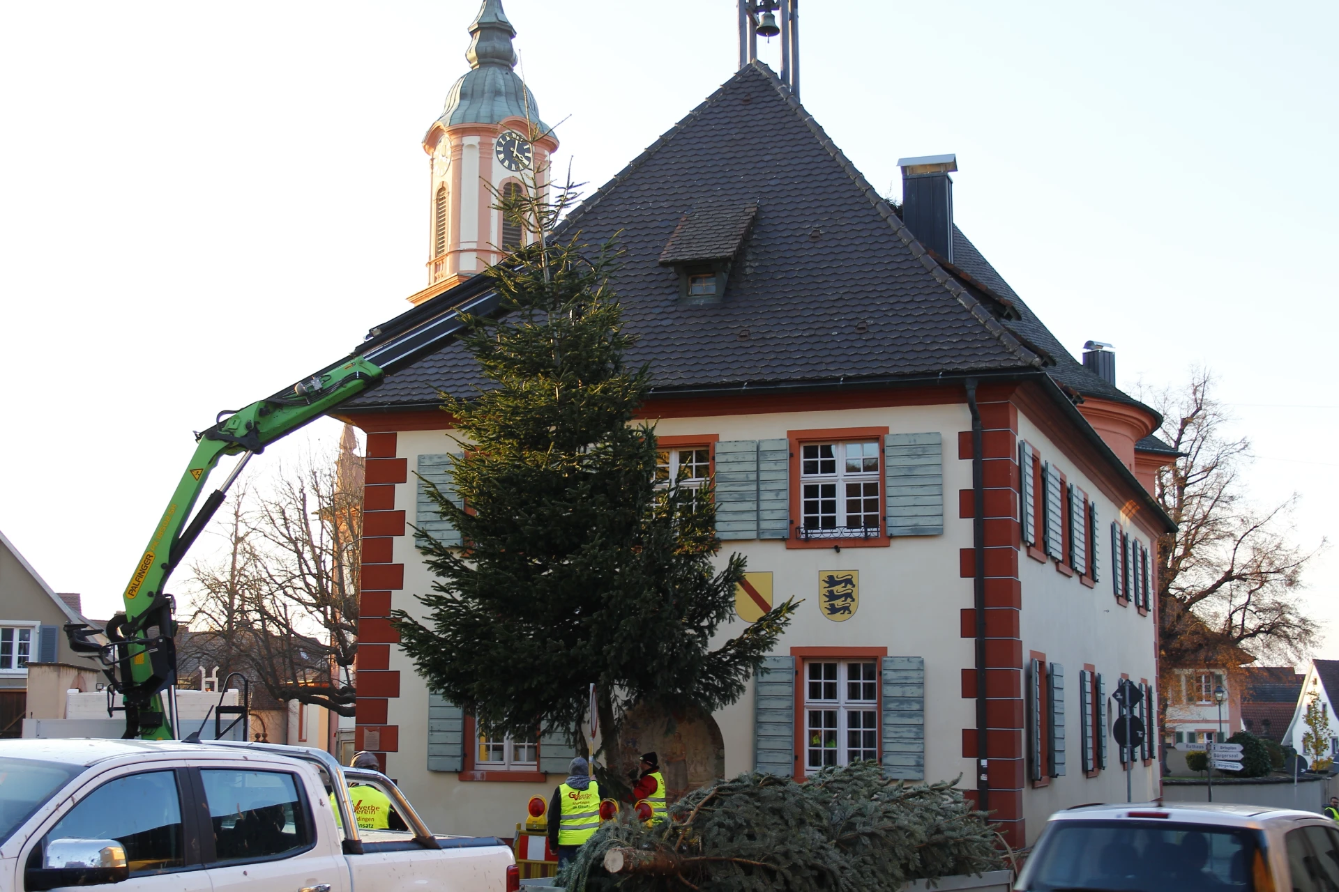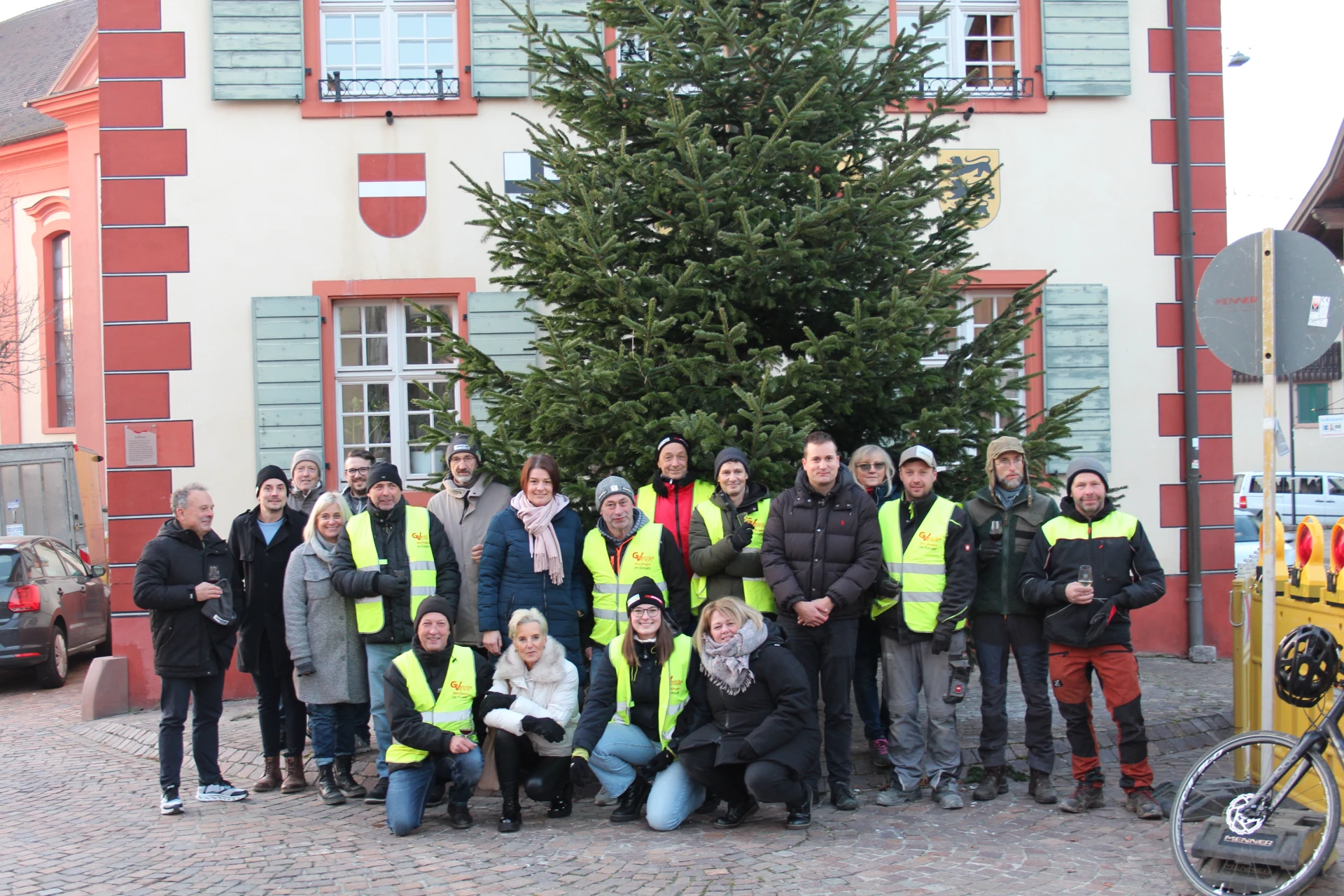 Wir hatten Traumwetter mit Sonnenschein, aber knackig kalt bei Minusgraden. Wie schon in der Vergangenheit wurde der Baum angeliefert. Dieses Mal war um 16 Uhr der Beginn. Um die 20 Helfer waren gekommen. Die meisten wurden mit Warnwesten ausgestattet.