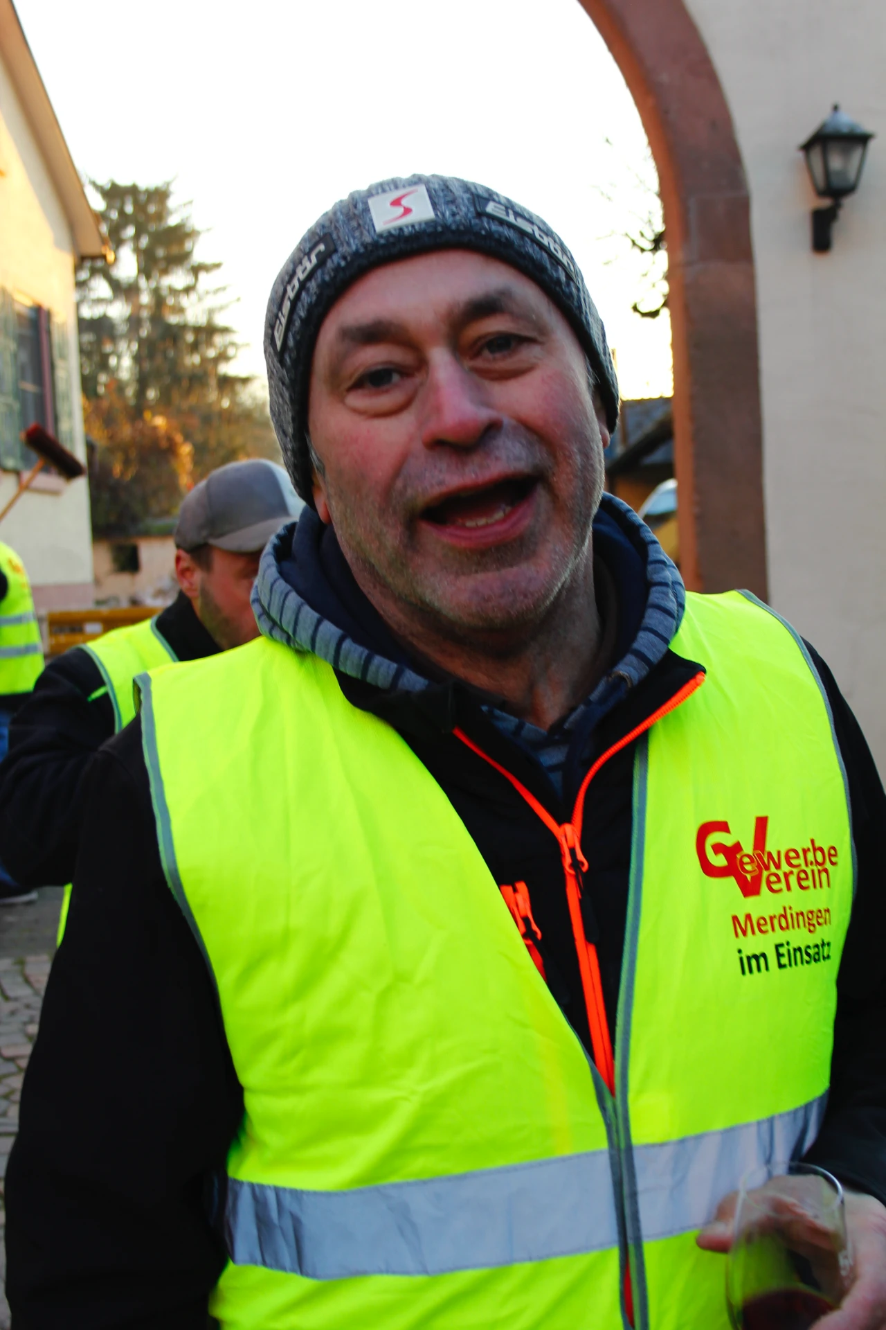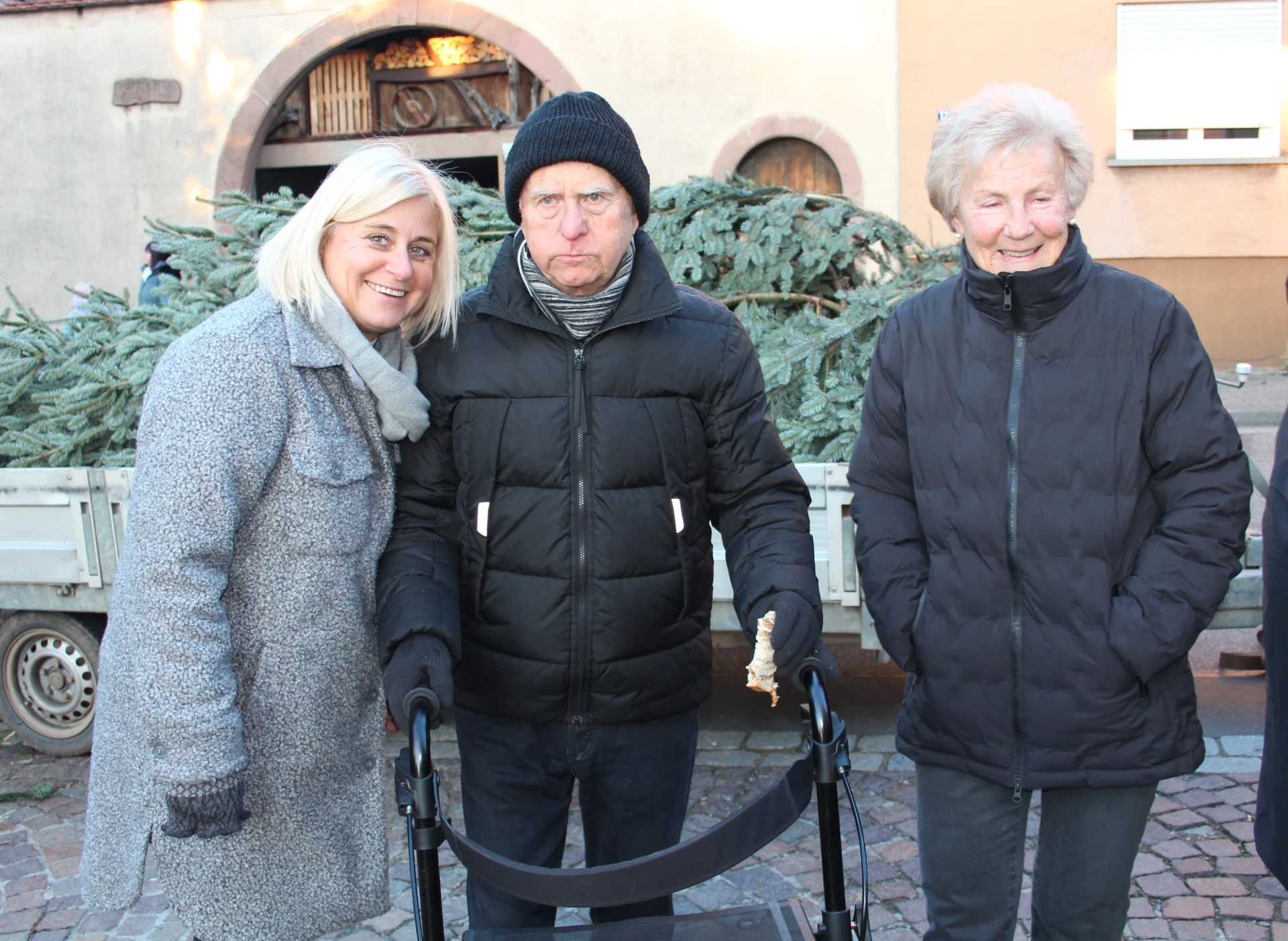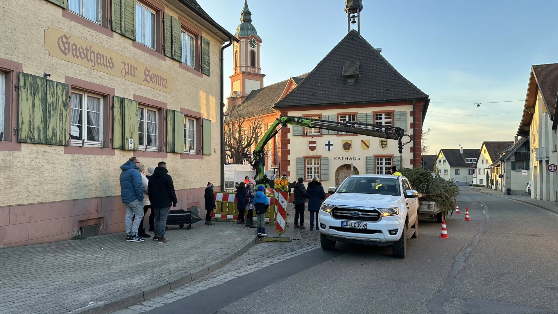 Wir hatten Traumwetter mit Sonnenschein, aber knackig kalt bei Minusgraden. Wie schon in der Vergangenheit wurde der Baum angeliefert. Dieses Mal war um 16 Uhr der Beginn. Um die 20 Helfer waren gekommen. Die meisten wurden mit Warnwesten ausgestattet.