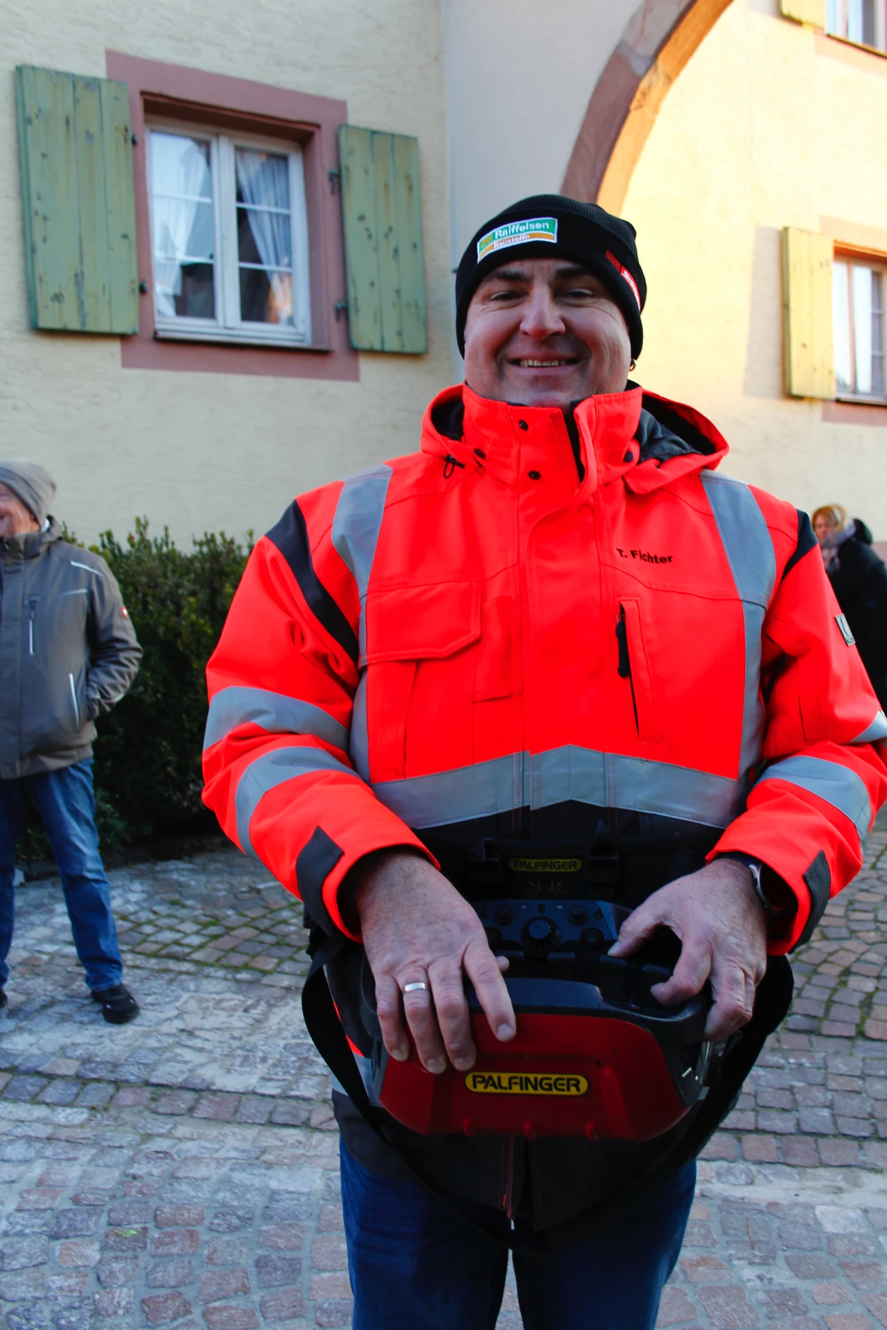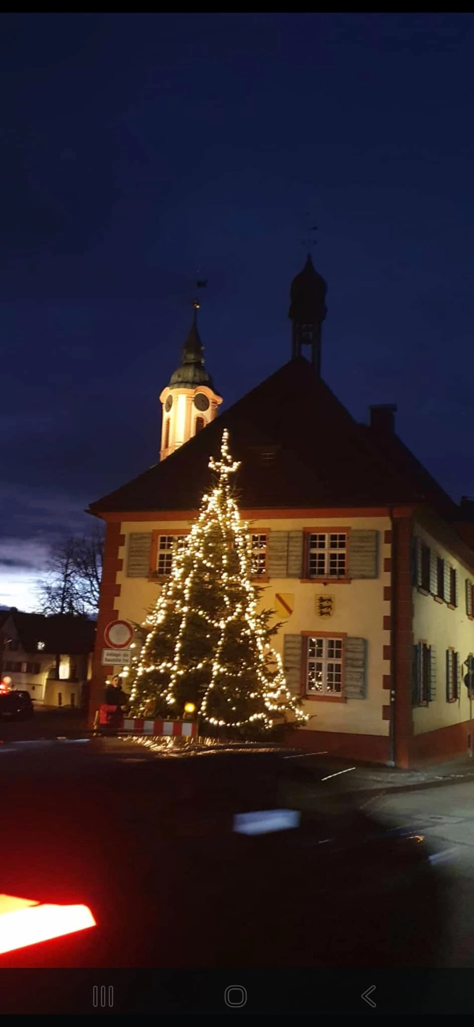 Kranwagenfahrer Timo Fichter jonglierte unseren Baum an seine endgültige Bestimmung. Die Langgasse war professionell abgesichert. Nachdem der Baum verkeilt war, konnte man endlich zum gemütlichen Teil übergehen. Trotz vorgewärmten Wein wurde es immer kälter (-7 Grad) und als die Sonne ganz weg war, waren unsere Helfer auch bald zu Christoph Süßle verschwunden, um sich aufzuwärmen.
